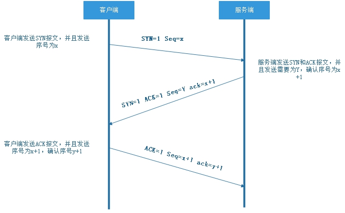 客户端收到服务器发来的确认号正确,客户端再次发送确认ACK,SYN标志位为0,ACK标志位是1,确认序号=y+1=0+1,发送序号位x+1=1,服务器收到确认序号值与ack=1连接建立成功,开始传输数据