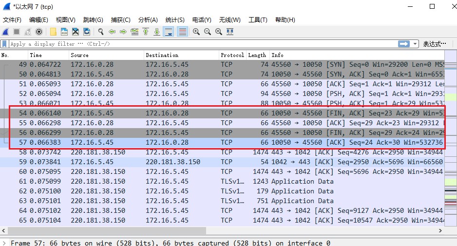 第一次挥手,客户端给服务器发送tcp包,用来关闭客户端到服务器的数据传输,发送FIN ACK报文 seq=23 ack=29
