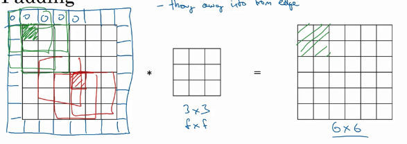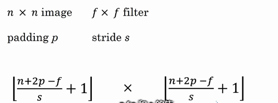 图像大小是nXn,滤波器是fxf ,最后的维度是(n-f+1)x(n-f+1),这样就越来越小了图像;图像边缘信息用得比较少,会丢失;所以要填充(就是把边缘的像素补成可以当滤波器中心点覆盖就行),填充像素大小为p:进过滤波器之后得到的大小为(n+2p-f+1)x(n+2p-f+1),注意p是两边分别填充大小,总的填充是2p