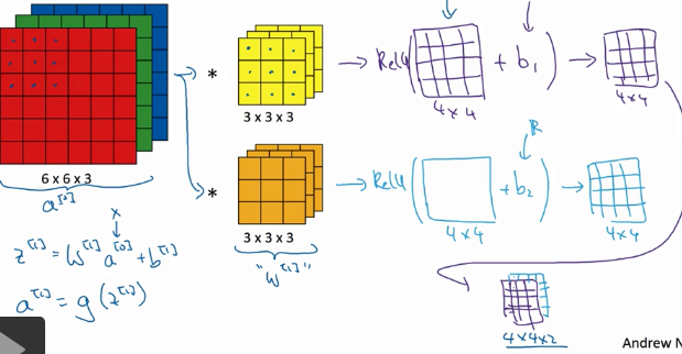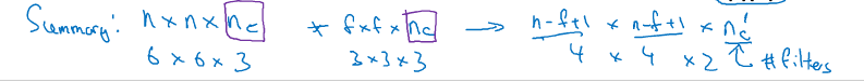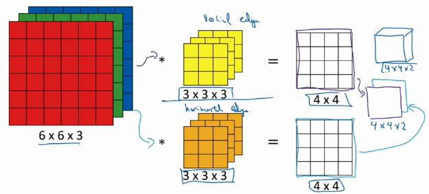 图片的大小:6x6x3,宽x高x通道数目channels,滤波器也是三维的:3x3x3 ,且两者的通道数必须匹配。最后与滤波器卷积之后得到的是4x4x1(即是二维的)。