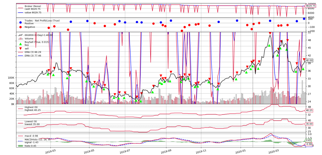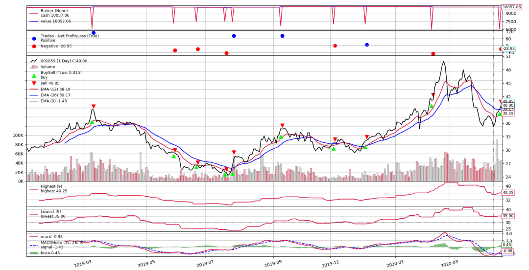 最终得到10057.06,赚了57块钱。。当然,总比单纯KDJ策略不赚的好。但是这个策略依然存在问题,它在很多能赚大钱的时候,过于保险地将股票卖出了,以至于其亏损的次数其实大于盈利的次数。