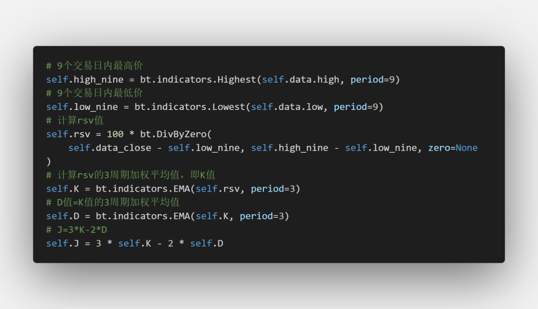 # 计算rsv的3周期加权平均值,即K值self.K = bt.indicators.EMA(self.rsv, period=3, plot=False)# D值=K值的3周期加权平均值self.D = bt.indicators.EMA(self.K, period=3, plot=False)