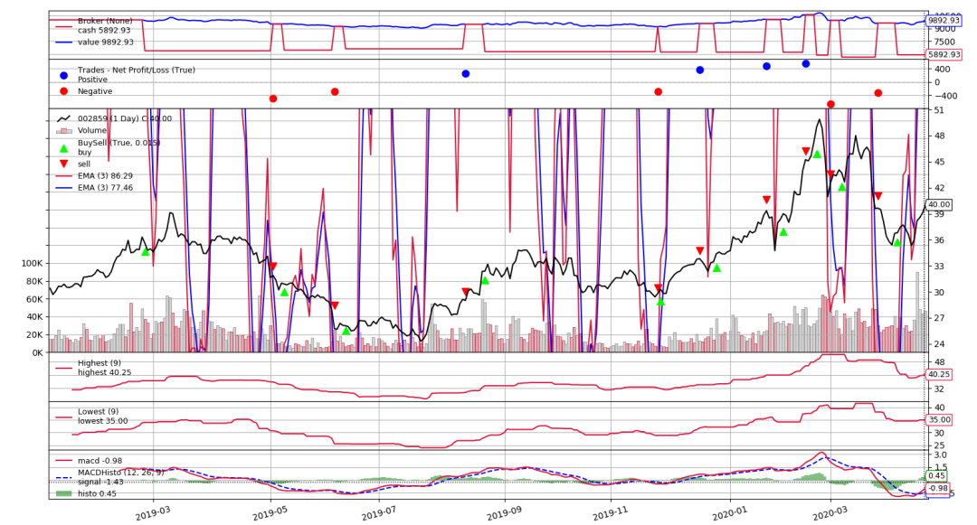 效果不是很好,本金10000元,最后剩余9892元,也就是亏损了。从盈利和亏损点上来看,该策略确实亏损次数更多,比盈利次数多了一次。