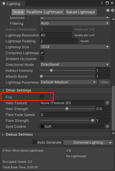 Fog的开启与否是针对于每个场景的,可以通过代码设置,也可以在Window->Rendering->Lighting Settings窗口中设置。