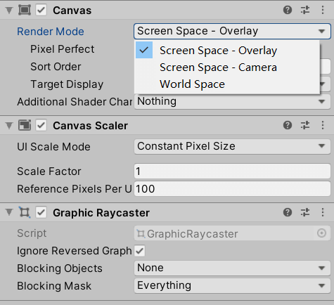 Canvas比较重要的属性设置有RenderMode和Pixel Perfect。渲染模式上有Overlay、Camera和World Space三种选择,以决定UI与镜头间的距离以及Canvas的特性;而Pixel Perfect可以勾选以避免模糊。其他的设置特性我们就不在此赘述了。