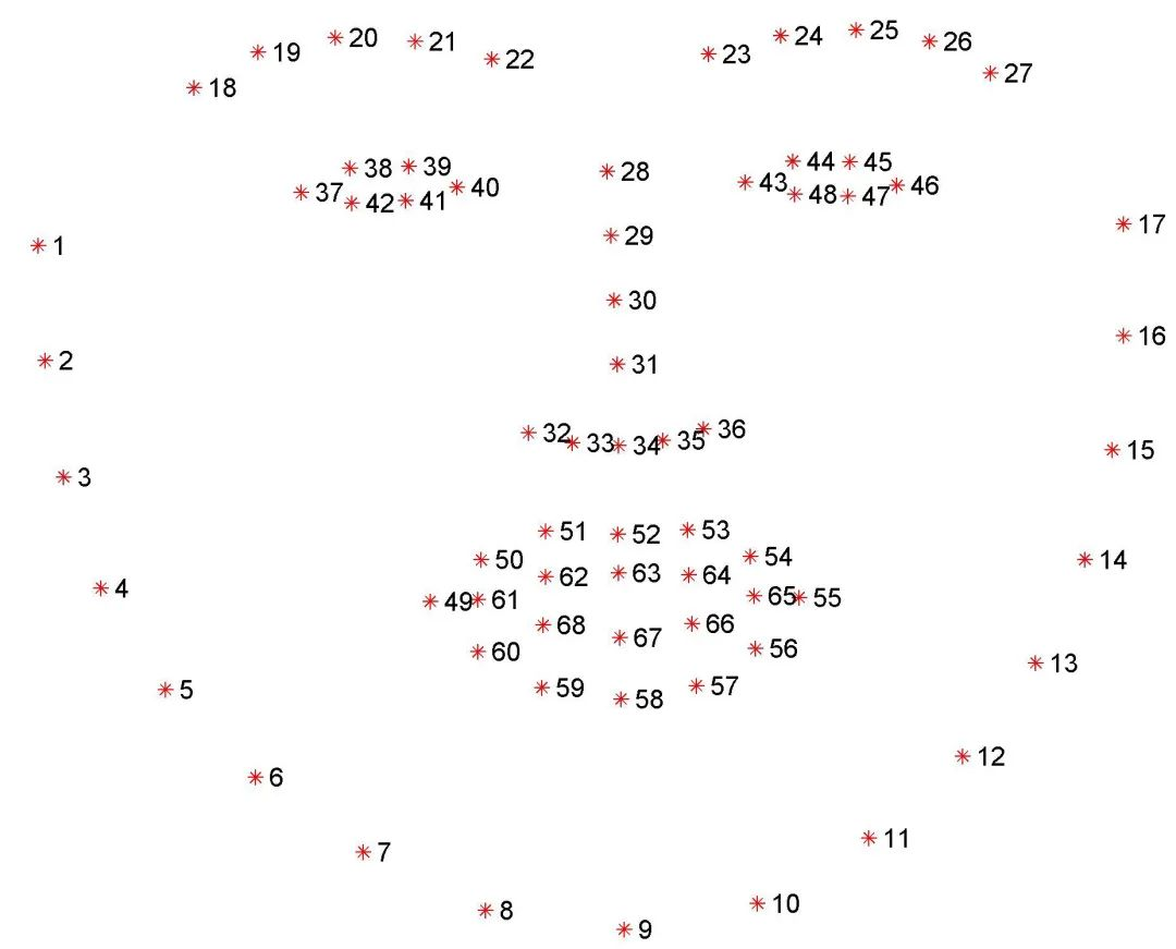 我们正在使用的dlib库中包含的预训练人脸关键点探测器,这是Kazemi和Sullivan(2014)用回归树集合论文实现的1毫秒人脸对齐算法,其中估计了映射到人脸结构的68个(x,y)坐标的位置。我们可以使用下图显示68个坐标或点的索引: