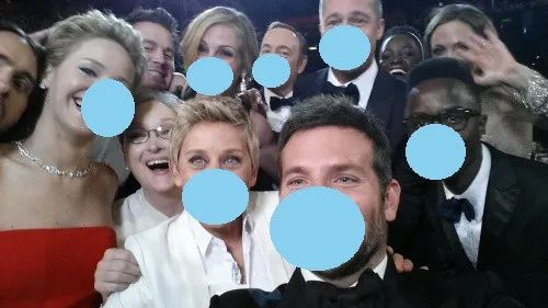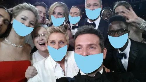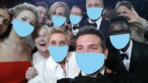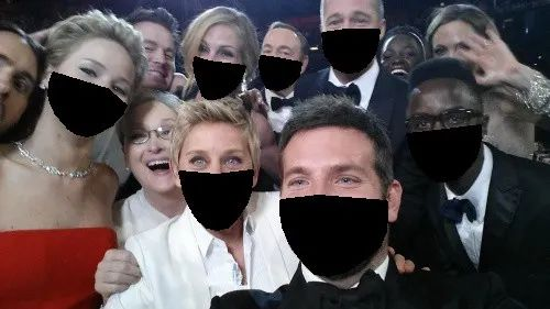 图5显示了原始输入图像(Barack Obama的图像)与使用脚本生成了口罩的输出图像之间的比较。我们也可以在人群镜头使用这个脚本。如图6所示,在著名的Ellen's wefie拍摄中,在检测到的人脸上叠加口罩的结果。
