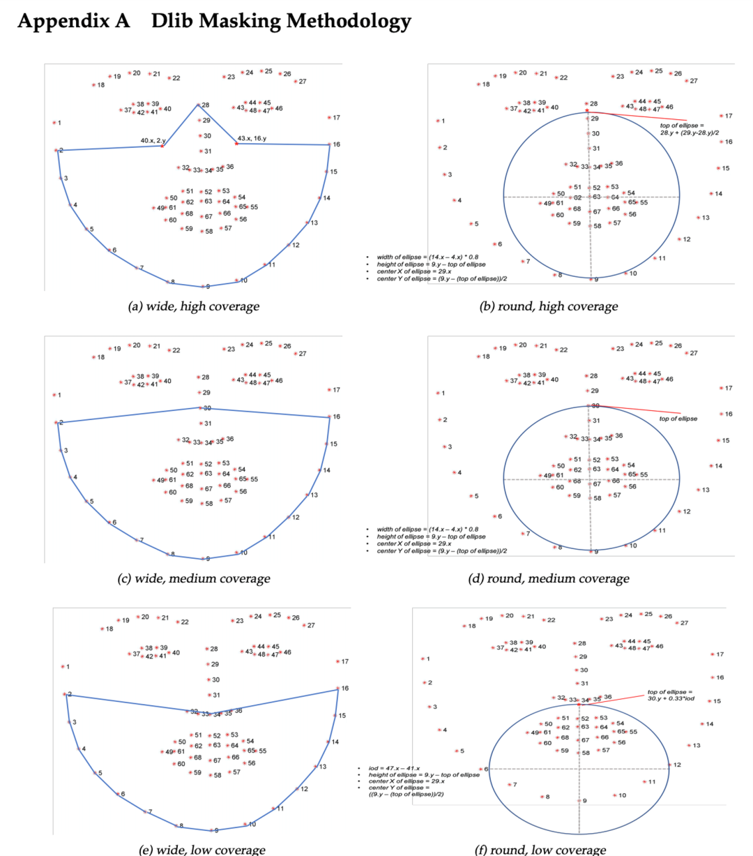 我们能够成功地复制生成5种不同类型的口罩过程(详见附录A),这些口罩可以使用dlib和OpenCV叠加在未带口罩的人脸的图像上。