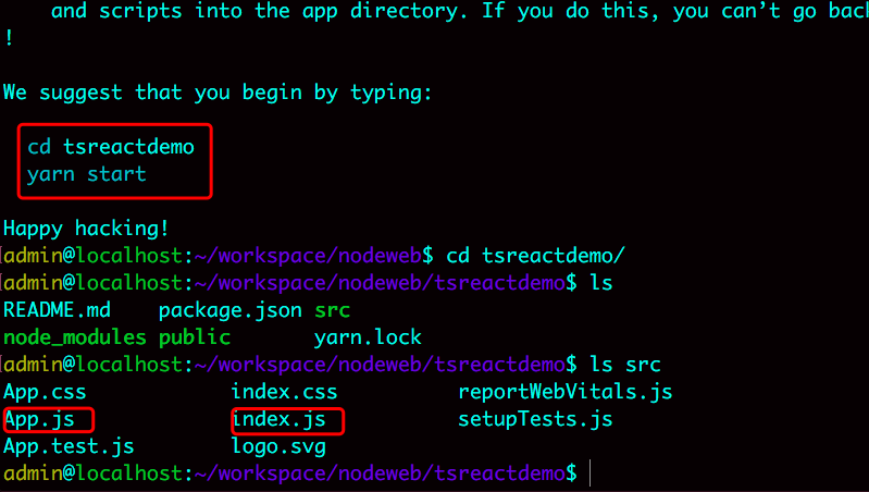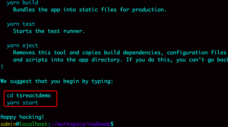 创建完成的成功提示与原来没有太大的区别,直接进入项目路径下,然后yarn start或者npm start。