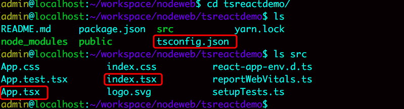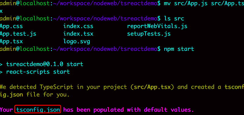 当我们修改了index.js,App.js文件为index.tsx,App.tsx之后,npm start 或 yarn start,默认会创建一个文件tsconfig.json,这也是官方明确说明的,我们没有必要手动创建tsconfig.json。