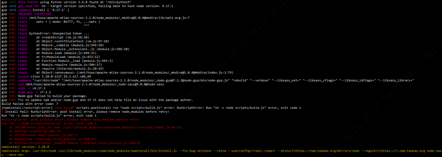 gyp ERR! command "/usr/bin/node" "/mnt/hswx/apache-atlas-sources-2.1.0/node_modules/_node-gyp@7.1.2@node-gyp/bin/node-gyp.js" "rebuild" "--verbose" "--libsass_ext=" "--libsass_cflags=" "--libsass_ldflags=" "--libsass_library="