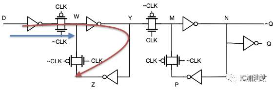 hold time: 第一个传输门关闭需要的时间,在传输门关闭期间,D->W要保持稳定,这样在传输门关闭之后,W稳定才不会导致背靠背反相器锁住的值发生变化。