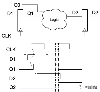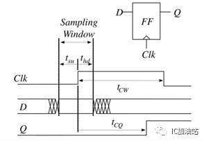 clk-to-q time: 输入D满足setup/hold time要求,从时钟沿到来时刻到输出端Q变化至稳定的时间