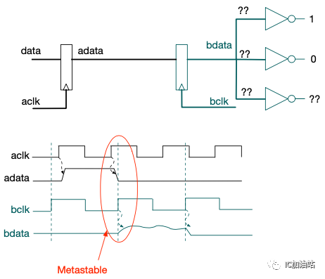 当bdata发生亚稳态的时候,会造成什么影响呢?影响主要发生在bclk时钟域的后级电路上,让后级电路无法sample到一个确定的正确的值,进而导致运算逻辑错误。
