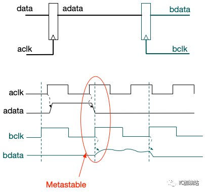 接下来我们就可以正式进入跨时钟域的讨论了。当只有一个时钟存在时,life is simple,只要保证setup/hold time就好了,那么当有多个时钟存在的时候会发生什么呢?我们来看最简单的情况,如下图所示,aclk时钟域的信号需要传输到bclk时钟域去。在各自时钟域内,EDA工具可以保证触发器不会产生metastable,但是当aclk和bclk异步的时候,我们是无法保证aclk和bclk之间的关系的,也就是说adata相对于bclk的沿来说,可能在任何时候发生变化,这样bdata这个flop就可能产生亚稳态。