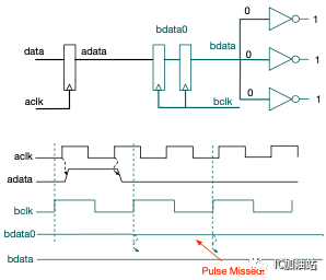 其实在这个例子中,adata在aclk域一个周期就翻转了,其实是aclk域的一个pulse信号。对于pulse信号,我们其实不应该用double flop来同步,原因很简单,就是上面所示的可能丢失pulse。那么面对pulse,我们该怎么同步呢,那就且听下回分解吧。