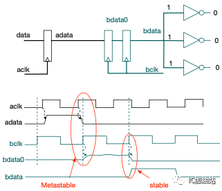 那你可能会问,上一讲你不是说第一级的flop的输出可能需要很长时间才能稳定吗?你凭什么说在第二个时钟沿到来的时候bdata0就能稳定呢?如果还是不稳定,让第二级flop产生了setup/hold time violation,那第二级flop不还是有可能产生metastable么?