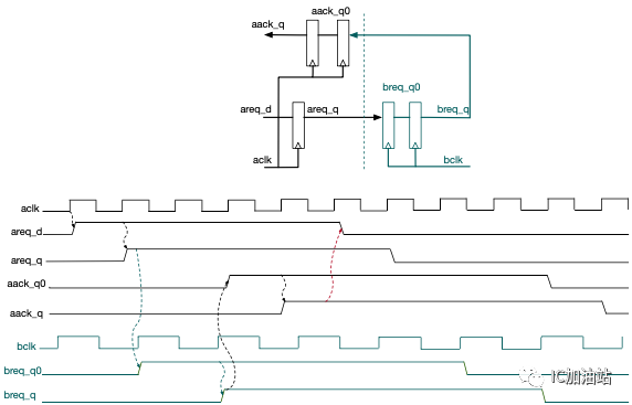 如果必须要求adata的每一次翻转都同步到bclk,一个办法就是利用反馈。也就是说信号从aclk域同步到bclk域,再同步回aclk域。aclk的data只有看到同步回来的值之后才能再翻转。如下图所示