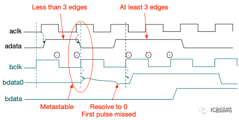 其实使用double flop来同步,有个最基本的“3个沿”要求,就是source data必须保证稳定不变至少碰见destination clock 3个连续的沿,这个沿可以是上升沿也可以是下降沿,持续3个沿之后才能变,否则就有可能在destination clock domain根本看不到这个data的变化。例如下图所示:adata第一次变高,只碰到了bclk的2个沿,就可能导致bdata根本没有看到这个pulse,而第二次adata变高,持续了3个沿,这样bdata就能够确保也可以变高了。