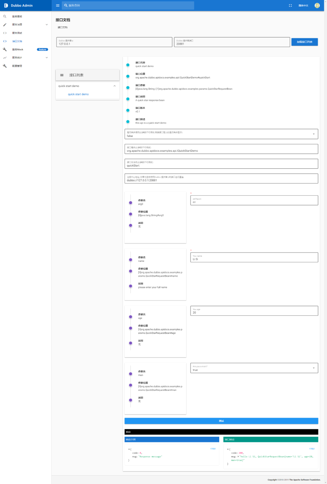 dubbo-api-docs-examples 中有更多更为详尽的例子,下文中有注解的详细说明。下面我们来看一下增加 Dubbo-Api-Docs 后的效果图:
