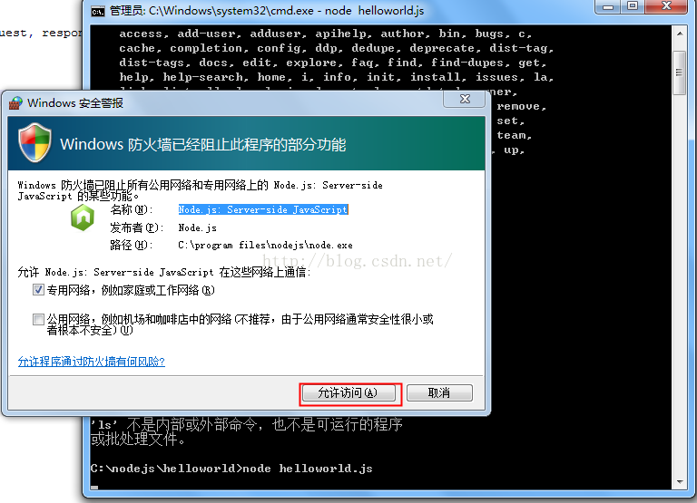 打开命令行,切换到“helloworld.js”文件的保存目录,执行:node helloworld.js
