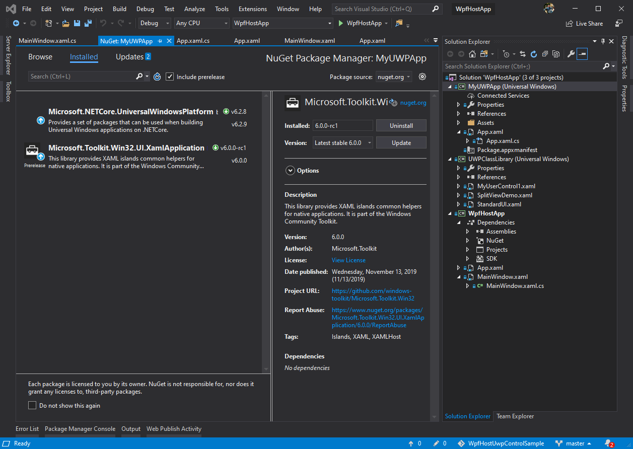 接下来创建的第二个工程,是一个空的UWP工程,UWP的版本确保是1903或者更新。通过NuGet安装Microsoft.Toolkit.Win32.UI.XamlApplication。这个空的UWP工程将成为WPF程序和UWP Custom Control之间的桥梁。
