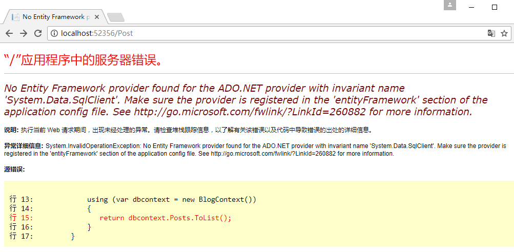 在本例中EF安装到了BlogRepository类库项目上,所以程序在启动时是无法读取到这些配置信息的,但要注意的是错误信息的重点在于“找不到ADO.NET Provider”而不是找不到配置信息。所以实际上这个问题的根本原因在于安装EF组件后,默认会添加EntityFramework.dll以及EntityFramework.SqlServer.dll两个库文件的引用,但是由于EF没有安装到启动项目上,所以在项目编译时只会复制主项目依赖的程序集,以及被依赖程序集使用到的程序集。就是说BlogRepository只用到了EntityFramework.dll而没有使用到EntityFramework.SqlServer.dll所以后者没有在主项目的bin目录下,所以仅需要将该程序集复制到MVC项目的bin目录下即可运行: