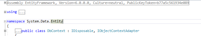 DBContext是EF中的核心类型,EF中的从数据库获取数据填充到实体对象、变化跟踪以及将数据持久化到数据库都是有DBContext完成的。而创建一个DBContext最常用的方法就是继承DbContext类型来实现,DbContext类型位于EntityFramework程序集下的System.Data.Entity命名空间下: