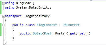 因为BlogRepository是管理数据存储的库,所以应该将EntityFramework安装到该项目上: