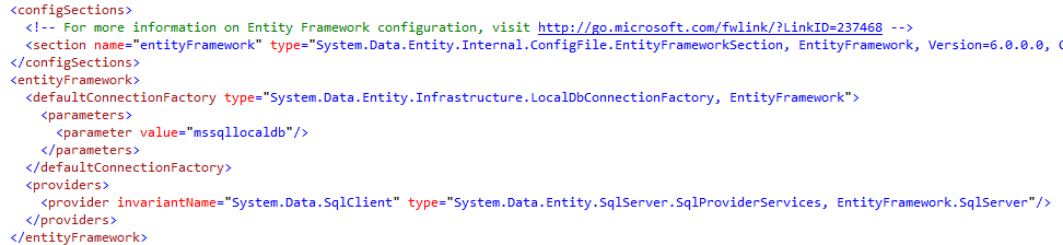 在使用Nuget安装EF的时候会自动在Web.config或者App.config中创建一下配置信息: