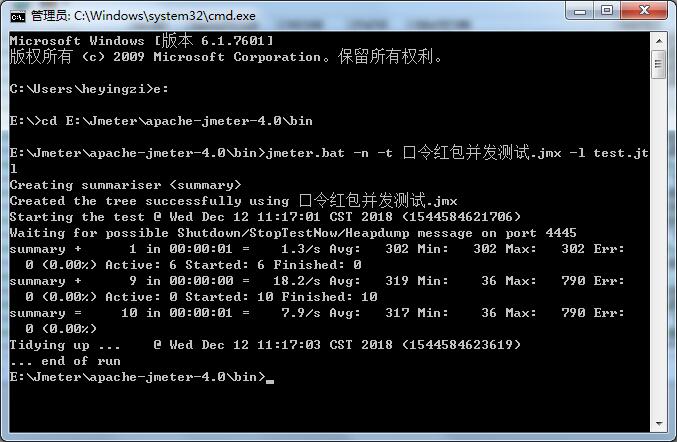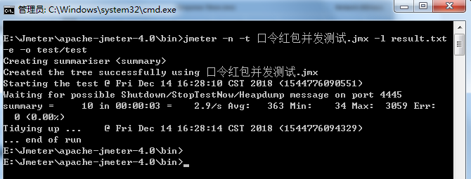 命令:jmeter -n -t 口令红包并发测试.jmx -l test.jtl