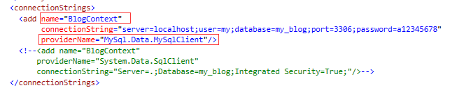 注:name与DbContext类型一致并且providerName是MySql.Data.MySqlClient,这与SQL Server不一致,需要特定的程序来解析和使用连接字符串。