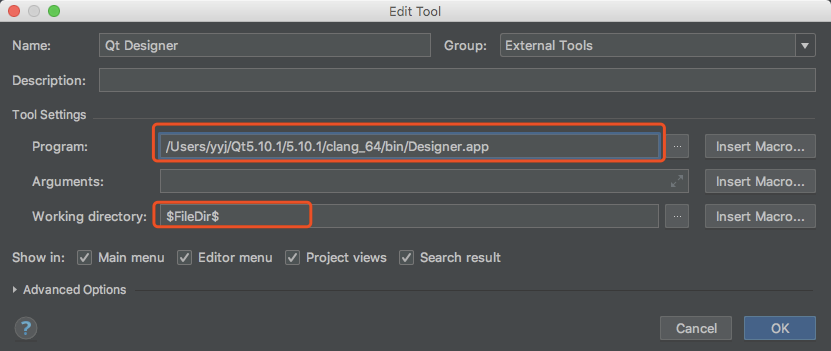 如下,路径就是安装qt 的路径,工作路径选择filedir 即可。