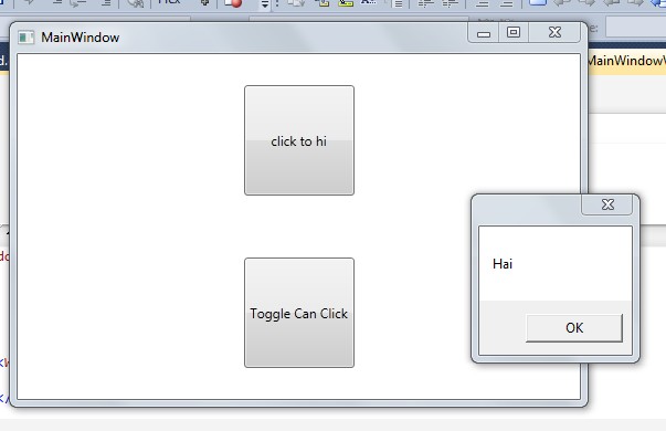 我们建立一个应用样板。当点击按钮时显示一个“HI"消息框,我们添加另一个按钮,切换hi按钮是否可以点击。