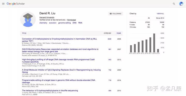 我个人的经验是,想要去系统的搜索一个人代表性工作,那么谷歌学术的学者页一定是最好的选择之一。谷歌学术搜索David R. Liu,第一个搜索就会推荐这位学者的主页,点进去就可以看到这个人的所有工作,而且可以以两种方式进行排序,一是以时间,可以看到从最新的一篇文章开始到其第一篇科研工作发表的时间内所有文章的先后顺序。第二种就是以引用量才做排序。