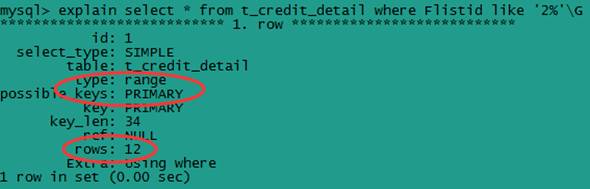 不以通配符开头的sql语句,例如:select * from t_credit_detail where Flistid like '2%'\G
