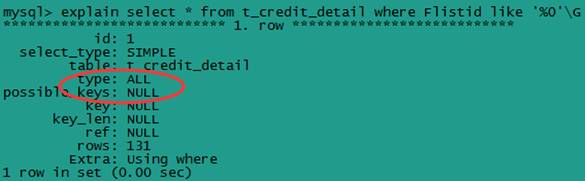 以通配符开头的sql语句,例如:select * from t_credit_detail where Flistid like '%0'\G