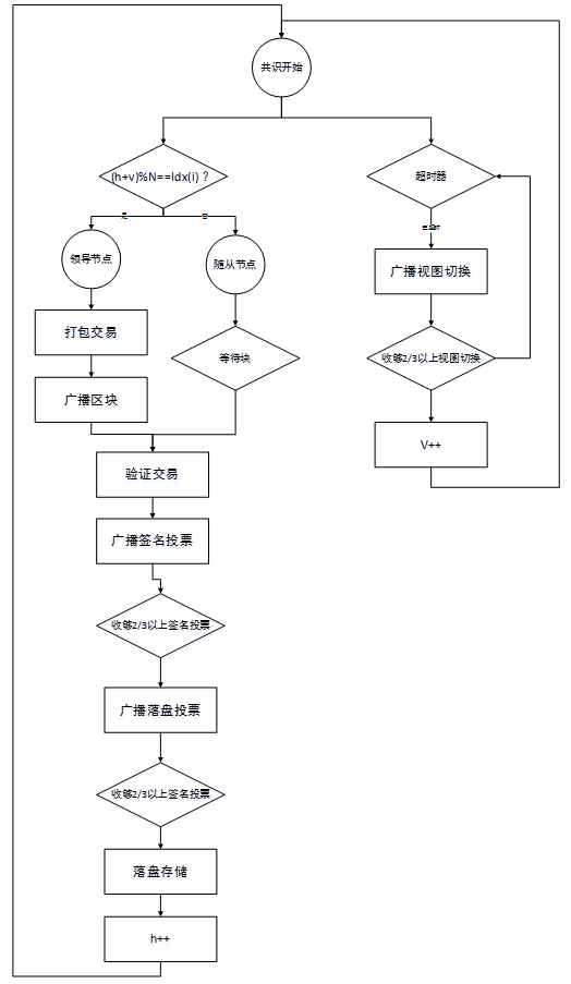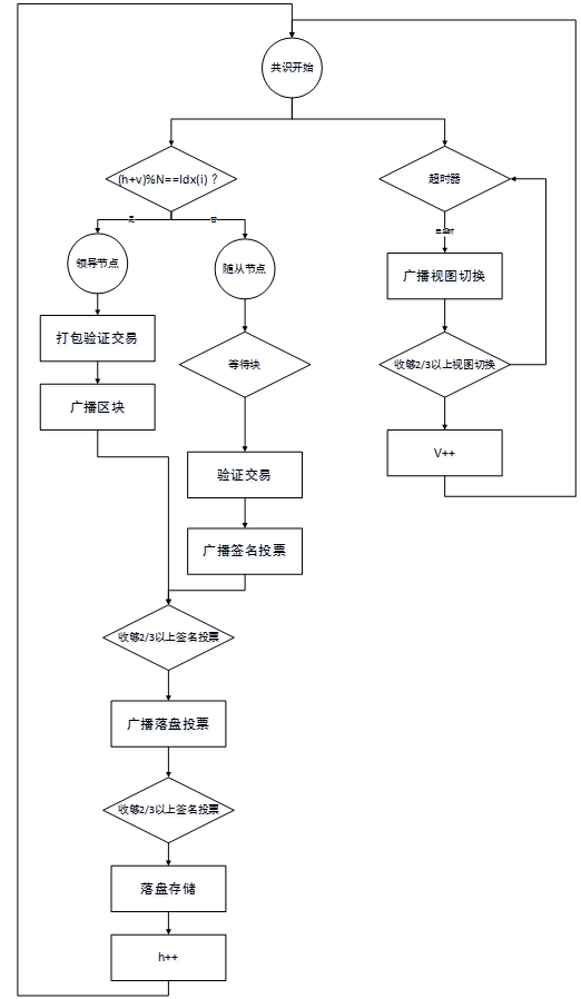 当一个节点完成块h的落盘存储之后,意味着它就需要开始块h+1的共识过程,此时会对块h+1的共识设置一个超时器,当到达超时还未完成共识过程就会引起视图切换过程。视图切换的过程首先是将自己的视图v++,然后把v全网广播告知所有节点,如果收到2/3以上节点都有相同的视图v切换请求,就顺利切换到下一个视图。