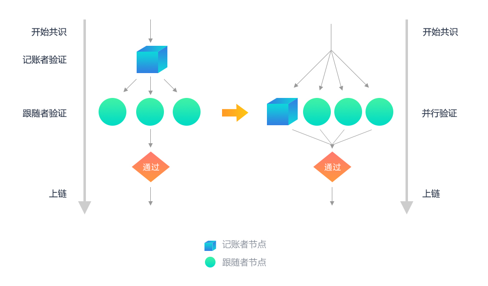 同时,我们对网络健康度、节点存活等因素进行检测,当发现有的记账节点无法服务时,快速切换到下一个记账节点,避免出现全体节点出现空等待的状况。