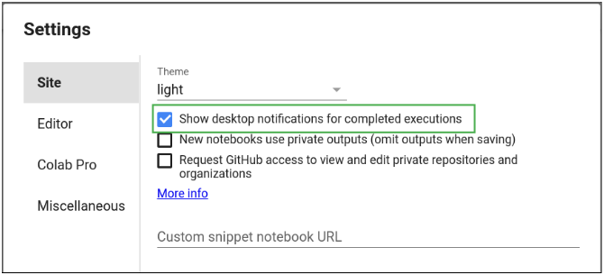 如果你要执行耗时较长的任务(例如训练模型),你可以将 Colab 设置为在完成后发送桌面通知。