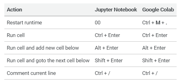 快捷键为编程带来了便利,但 Jupyter Notebook 中的快捷键不能直接在 Colab 中使用。不过,这里有一个关系映射表来解决这一问题。从中可以看出,你只需要在 Jupyter 的快捷键前面加上「Ctrl +M」就能在 Colab 中使用。此规则适用于大多数快捷键。