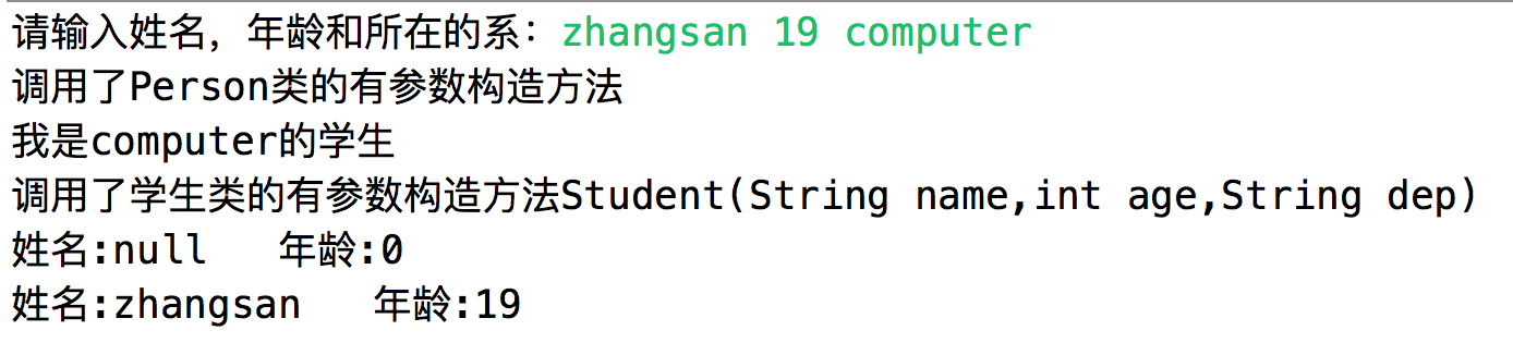 System.out.println("调用了学生类的有参数构造方法Student(String name,int age,String dep)");