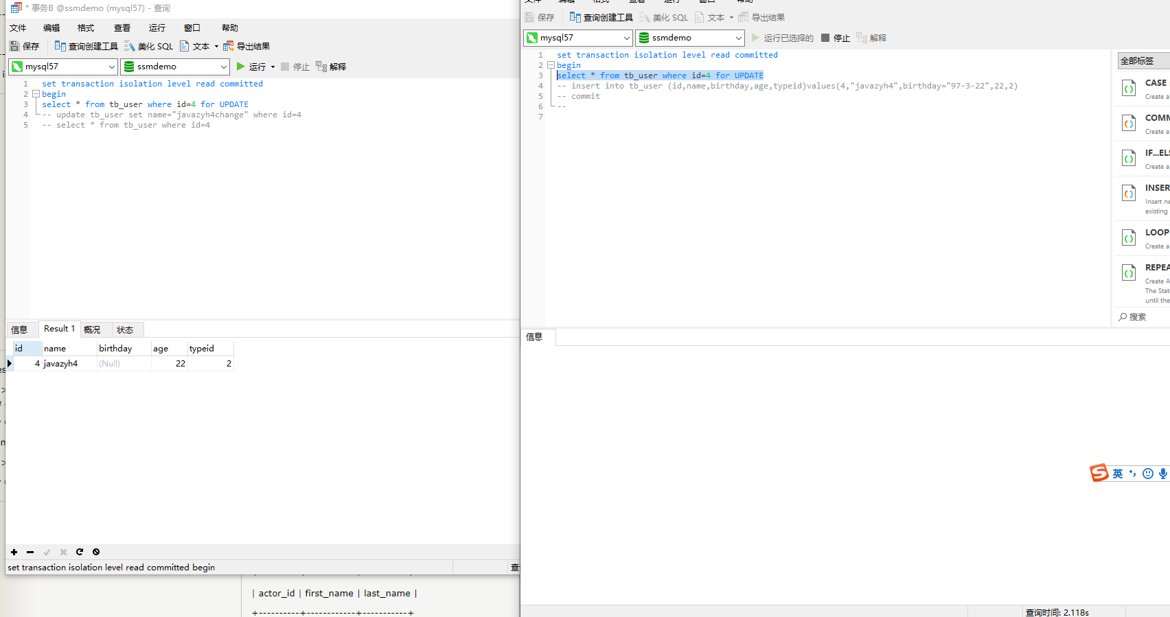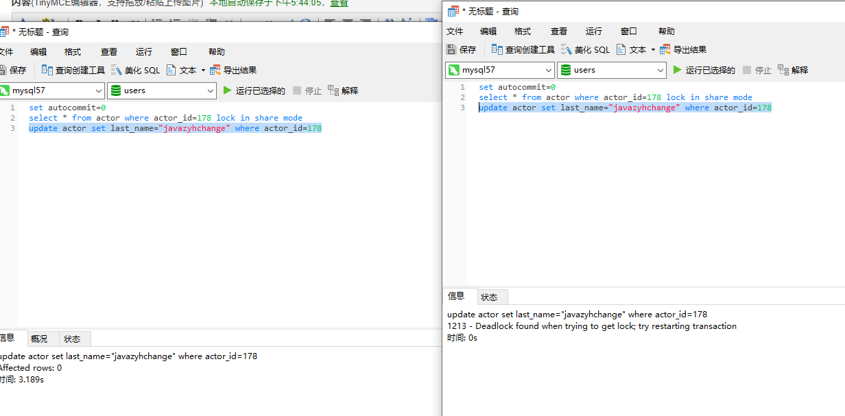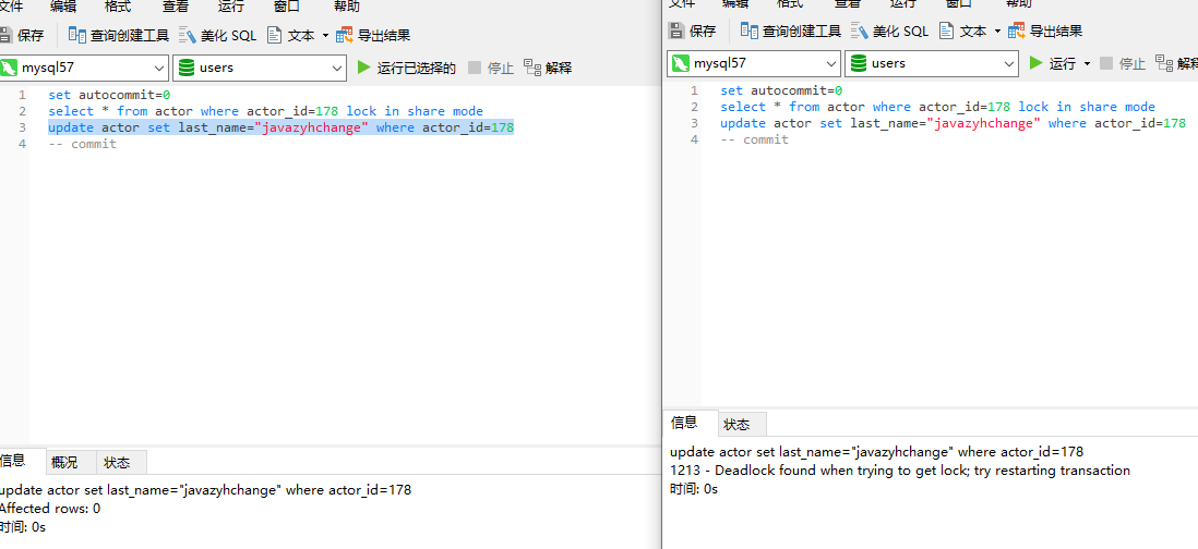 开启两个事务,set autocommit=0的含义是设置当前session禁止自动提交,需要显示commit才可以提交。详见:https://www.cnblogs.com/langtianya/p/4777662.html。