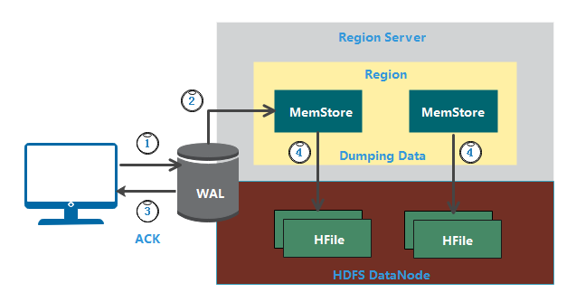 数据写入过程一样要进行寻址,需要先得到 Region Server 才能继续操作。写入机制按顺序执行以下过程(参见上图):