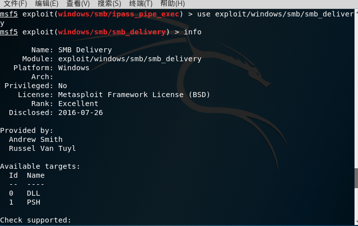 1.msf > use exploit/windows/smb/smb_delivery //使用smb_delivery漏洞