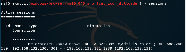 生成一个URL:http://192.168.132.130:80/,在靶机的IE浏览器上使用该url进行访问,攻击成功