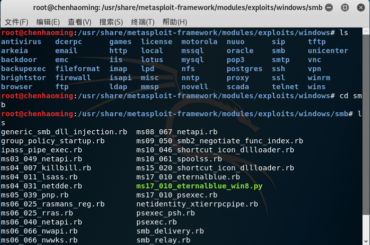 1.进入到/usr/share/metasploit-framework/modules/exploits/windows/smb路径下,查看可利用的漏洞